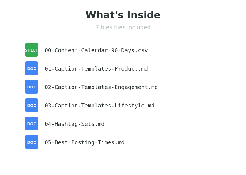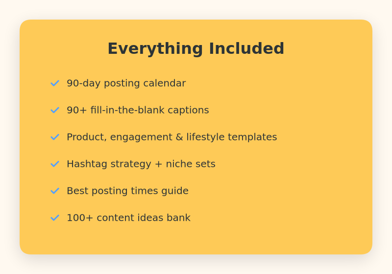 90-Day Content Calendar, 90+ Caption Templates, Hashtag Strategy + Pre-Made Sets, Best Posting Times Guide, 100+ Content Ideas Bank
