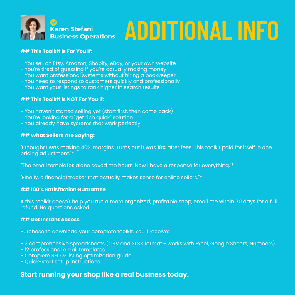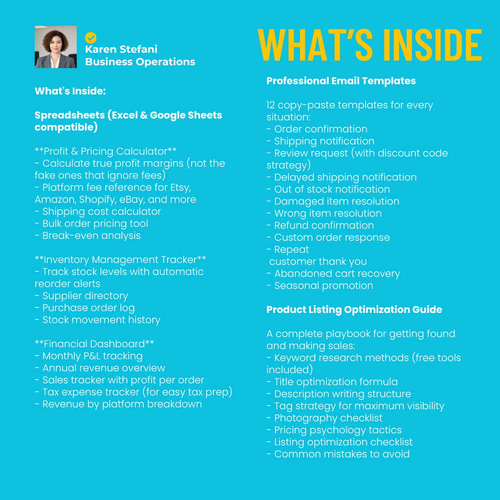The ECommerce Seller's Toolkit gives you the exact systems used by 6-figure sellers to track inventory, price products profitably, manage finances, and communicate professionally with customers.