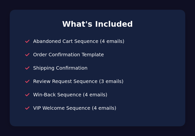 Stop staring at blank emails. 50+ proven templates for abandoned carts, order confirmations, reviews, win-backs, and more.
