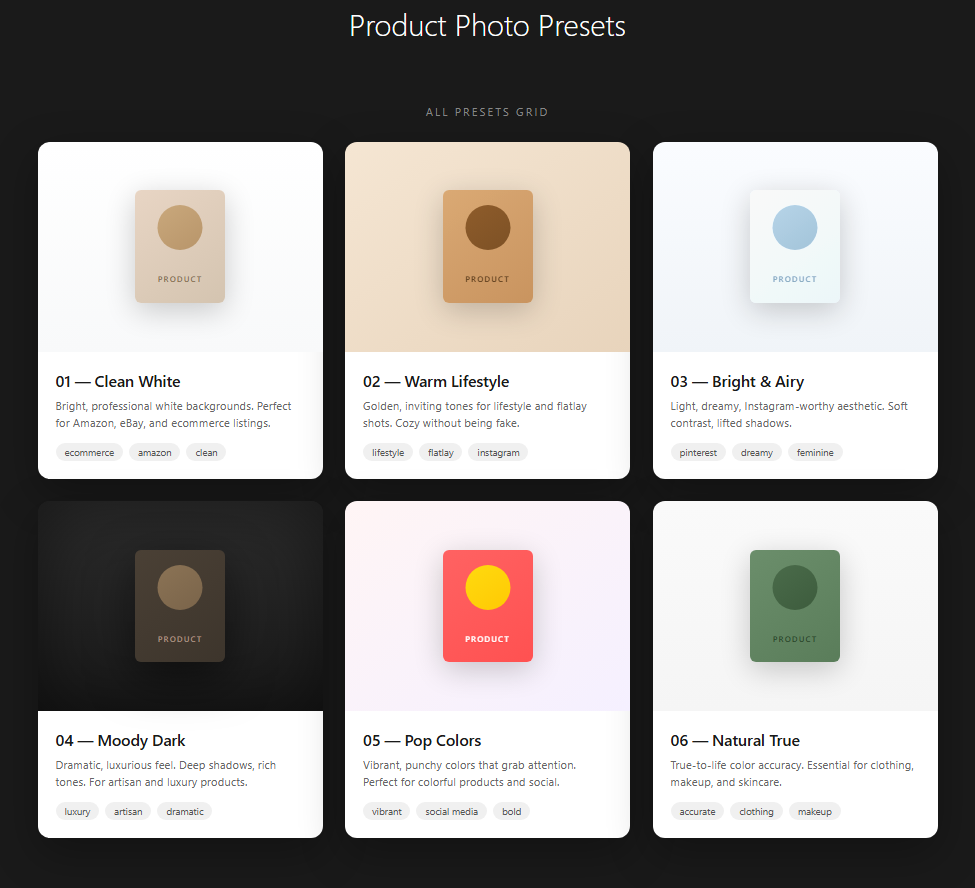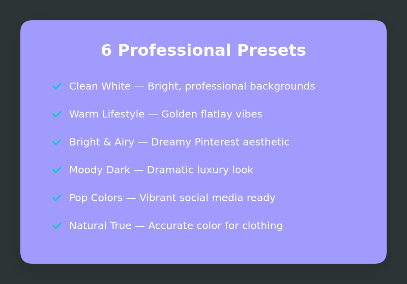 Whether you're shooting for Amazon, Etsy, your Shopify store, or Instagram, there's a preset for every style: