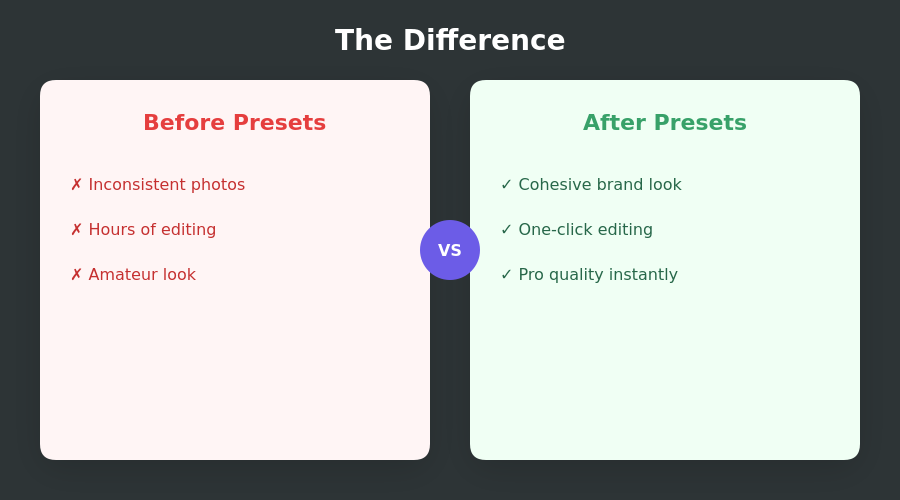 Most presets are designed for portrait or landscape photography. The settings that make skin glow make products look weird. The settings that make sunsets pop make your white backgrounds yellow.