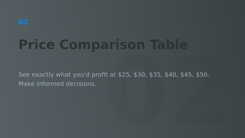 See exactly what you'd profit at $25, $30, $35, $40, $45, $50